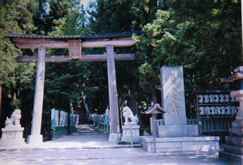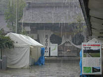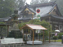 | 右側上の写真は、晴れている時の本宮社殿入り口。 かなり狭いかな? 下の方にも書いてあるけど、 本来の熊野本宮は今有るものより8倍の広さがあったんだよ。 洪水で流れてしまって、現在の地に鎮座してるんだもの。 … で、雨!雨! 大雨の熊野本宮〜〜(T_T) 写真ボケて見えるのはー 雨で煙ってしまったから。(苦笑) 巫女さんが傘さして歩いているのまで 撮れてしまった(^^ゞ傘、蛇の目傘じゃないしー 普通の傘なんだもん!興冷め。 古典的表現なら「いとわろし」 これは本宮社殿ではなく、別院なの。 社殿は撮影禁止なので門だけ〜 |