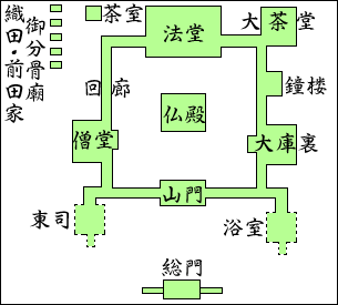 | 伽藍形式 伽藍形式は、広く日本にもたらされた中世中国の寺院建築を模して建立されたもので、伽藍の中央に塔があり、それを取り囲んで東・西・北に3棟の金堂全体を回廊が囲むという朝鮮半島の伽藍形式がそのまま持ち込まれたと考えられます。総門・山門・仏殿・法堂を一直線上に配列し、左右に僧堂と大庫裏を置き、加えて四周を回廊で結ぶなど、いかにも厳粛且つ整然たる伽藍構成である |