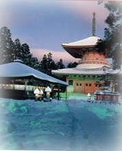| で、こっちが御影堂(みえどう)。宝形造りの木造桧皮葺、七間四面の優美な建造物で、堂内、内々陣に真如親王の奉写された大師御影を奉安し、堂内外陣には十二弟子の肖像を安置している。御廟と共に、山上で最も尊厳を尊ぶお堂。 雪が降って積もった感じのここは、これ以上ないぐらい幽玄美。圧縮しちゃってるので判りにくいと思うけど、小さい灯明が沢山ついててね雪明かりとぼんやり照らす陰が日本美ですよ。 ここは空海が生きていた頃は彼の持仏堂だったんだけど入滅してからは、弟子達が空海の遺影(もちろん絵)を飾った事から御影堂と言われるようになったのよ〜(^^ゞ 高野山のお坊さんからは、実は一番好きだと言われる事が多いのが、この御影堂なのです |